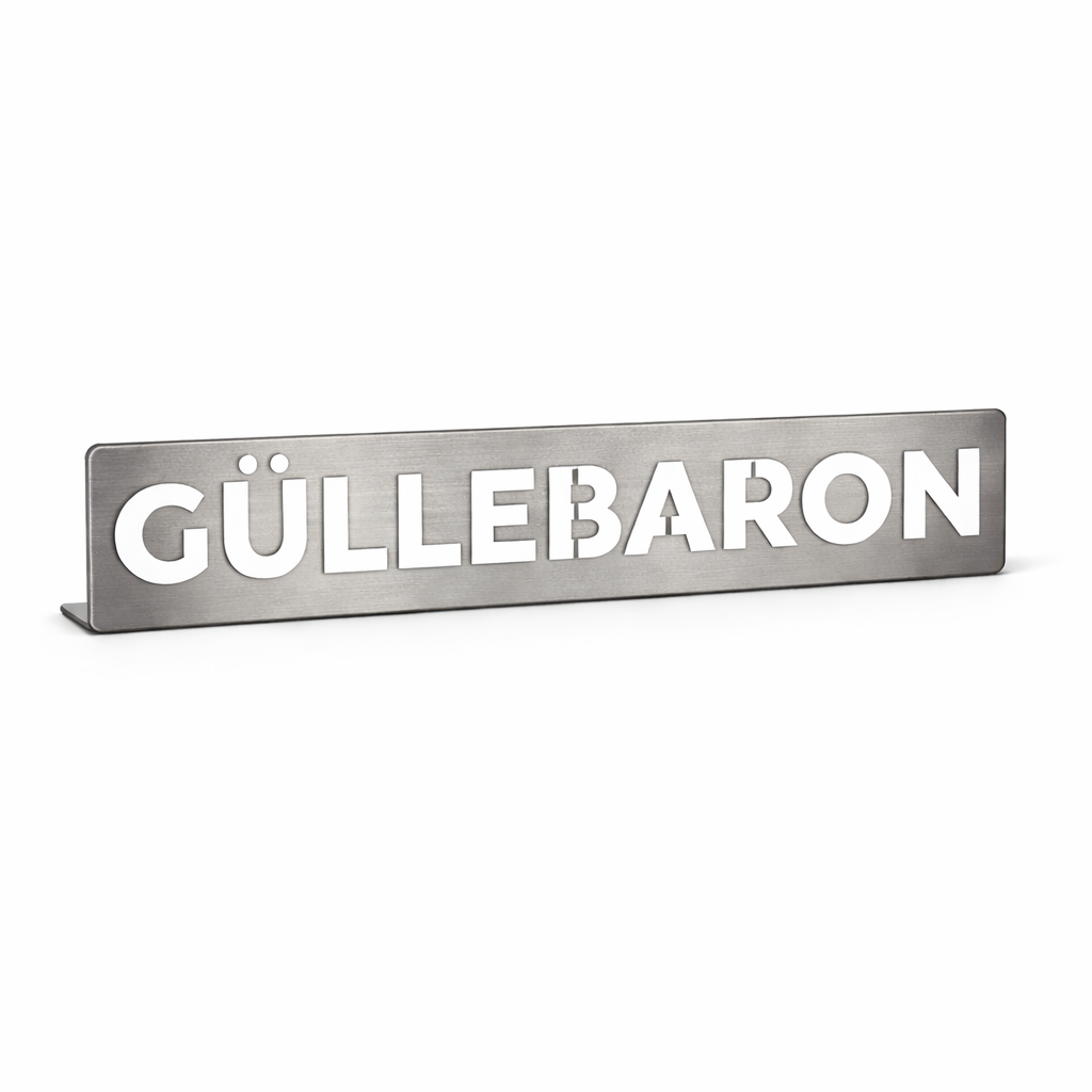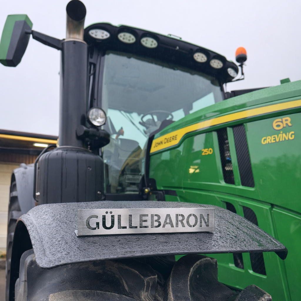 Dieses GÜLLEBARON Edelstahl-Schild wird präzise gelasert und ist speziell für die Montage an John Deere-Kotflügel bestimmt.